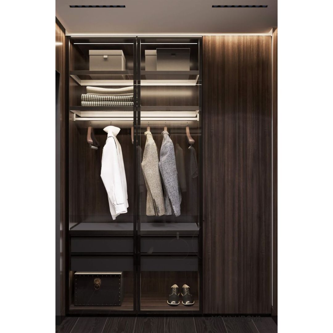 - All Inclusive: Glass Door + Closet Carcass + (Automatic) Built-in Light + All Hinges + Drawers + Hanging Bars
